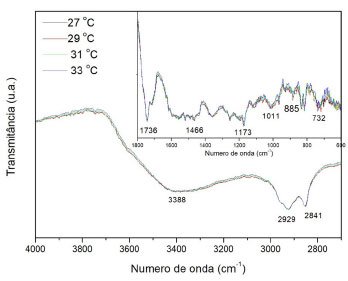 A Figura 10b mostra a dependência da intensidade de absorção com a temperatura do tipo Arrhenius, como pode ser visto pela equação 1.14,15 ![]() sendo IA - intensidade de absorção, A - constante experimental dependente do sistema, E energia do nível, k constante de Bolstzmann e T temperatura absoluta. O aumento da temperatura reduz a interação do formador de cor com o solvente, promovendo a diminuição na absorção do formador de cor e, por consequência, a redução na intensidade da banda no espectro. No caso de corantes leucos, pode estar relacionado à abertura do anel.16 As mudanças observadas pelas medidas de DRX e eletrônicas através das medidas de absorbância na região UV-Vis, mostraram ser dependentes da temperatura, e o sistema mostrou-se adequado para mostrar essas alterações. Os principais picos de absorção nos espectros de infravermelho correspondem ao metil estearato, 2929, 2841, 1736, 1466, 1173, 1011, 885 e 732 cm-1.17 A Figura 11 apresenta os espectros vibracionais na região do infravermelho para a tinta com temperatura de transição de 31 °C, medidas à 27, 29, 31 e 33 °C.