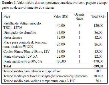 Acessórios para medidas em função da temperatura são produzidos e recomendados pelos próprios fabricantes dos equipamentos, os quais são normalmente importados e seus valores estimados em dólares. A Quadro 1 apresenta os valores individuais e totais para a montagem do sistema utilizado neste artigo. É importante destacar que o custo desses sistemas não ultrapassou R$ 1.000,00 (mil reais).