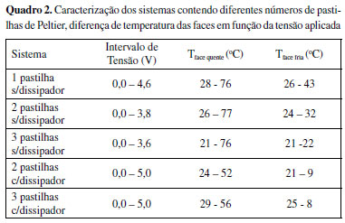 RESULTADOS E DISCUSSÃO Pastilhas de Peltier Os sistemas foram montados com uma, duas e três pastilhas de Peltier, com e sem dissipador de calor de alumínio, com dimensões de 90 mm / 90 mm / 40 mm, esse estudo foi realizado para verificar a diferença de temperatura entre as faces que aquece e que esfria. O Quadro 2 apresenta o intervalo de tensão utilizada e as temperaturas máximas e mínimas das faces.