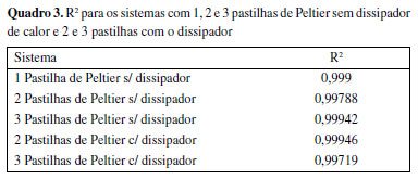 O Quadro 3 apresenta a linearidade da diferença de temperatura em função da tensão aplicadas para todos os sistemas.