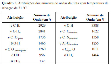 Alterações nos picos em 1736 e 1260 cm-1, correspondente aos estiramentos C=Oplano e C-Ofora do plano, respectivamente e podem indicar mudanças no composto termocrômico, pois esses grupos funcionais são os principais responsáveis pela mudança de cor nesse tipo de composto. Porém, não foi possível observar essas alterações no número de onda devido à resolução do equipamento utilizado.