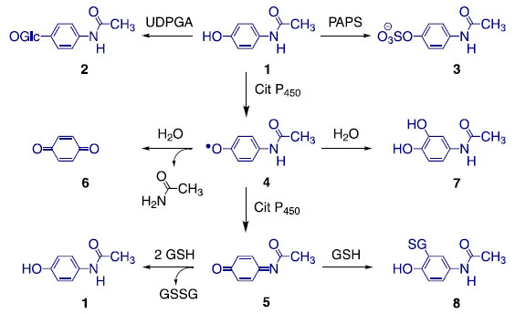 ![]() Figura 1. Reações e enzimas envolvidas no metabolismo do paracetamol