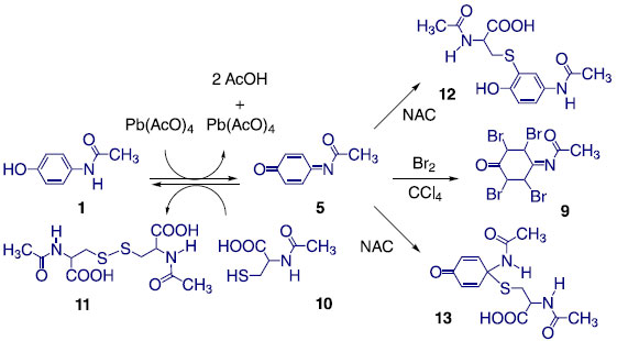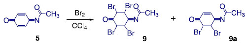 A caracterização do produto pode ser realizada usando um método físico simples de análise como o ponto de fusão, permitindo que o experimento seja realizado em qualquer laboratório de química farmacêutica. A principal característica indicativa da formação de NAPQI é a formação de um produto alaranjado intenso, indicado pela formação de compostos com sistema carbonila e imina α,β-insaturados e pela deslocalização de elétrons entre os grupos carbonila, imina e acetila com os grupos alcenos. Assim, o Pb(AcO)4 deve reagir com o paracetamol (1) por abstração de um hidrogênio radical (H) preferencialmente da posição fenólica formando ácido acético, tri-acetato de chumbo e N-acetil-p-benzosemiquinona imina (4). Esse mecanismo foi previamente elucidado por métodos de HF e DFT.44-46 A segunda abstração de H, desta vez do N-H do grupamento acetamida da semiquinona (4) libera outra molécula de ácido acético, di-acetato de chumbo e a NAPQI (5). Esse mecanismo usando uma molécula inorgânica é muito similar ao que pode ocorrer enzimaticamente nos sistemas biológicos, pela oxidação no sistema microssomal hepático contendo uma oxidase do tipo citocromo P450.47 Caracterização da N-Acetil-p-Benzoquinona Imina - NAPQI Além do ponto de fusão, a N-acetil-p-benzoquinona imina (NAPQI) pode ser caracterizada por um estudo de reatividade química. O principal grupo reacional facilmente caracterizável é a função química alceno, que pode ser determinada pela capacidade de reação em suas duplas ligações, descolorindo a solução de bromo em tetracloreto.48 A reação positiva da solução de NAPQI em acetato de etila foi evidenciada pelo descoramento da solução de bromo, indicando que houve a formação do produto oxidado, uma vez que tanto a solução de bromo, quanto a solução de NAPQI ficam incolor devido à reação, indicando a perda da conjugação do sistema carbonila e imina α,β-insaturados, formando um produto tetrabromado (9) ou dibromado (9a), como descrito na Figura 4. O PAR, pode ser usado como controle negativo, uma vez que não há reação entre a solução de bromo e o PAR nas mesmas condições, que pode ser observado pela persistência da coloração castanha da solução de bromo.