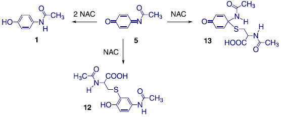 De fato, dois destes mecanismos (i e ii) foram inicialmente postulados e posteriormente caracterizados em sistemas biológicos com glutationa (GSH), uma vez que esse tripeptídeo contém os aminoácidos glicina, cisteína e ácido glutâmico e o grupo tiol (-SH) da cisteína caracteriza a GSH como um reagente nucleofílico semelhante a NAC (10). Desse modo, o grupo SH é o responsável pelas possíveis formas de reação da NAPQI (5) com NAC. Nossas proposições mecanísticas foram previamente observadas em derivados 3,5- e 2,6-dimetilados do paracetamol.33 Além disso, os resultados de redução estão de acordo com o efeito quimioprotetor da NAC em intoxicações com o PAR (1) já descritos na literatura (Figura 6).1-5