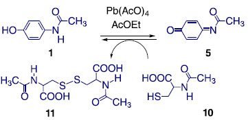 METODOLOGIA Reagentes e solventes Acetaminofen ou paracetamol (PAR), tetracetato de chumbo (Pb(AcO)4), N-acetil-cisteína (NAC) e bromo são reagentes obtidos da Sigma-Aldrich; etanol, acetona, acetato de etila e tetracloreto de carbono são solventes da marca Dinâmica. Alternativamente, o paracetamol pode ser extraído do medicamento genérico do laboratório Medley usando uma mistura de etanol-acetona (1:1) e N-acetil-cisteína da marca EMS pode ser utilizada nas reações de quimioproteção. Produção do derivado quinona-imina A N-acetil-p-benzoquinona-imina (NAPQI) foi preparada pela oxidação do paracetamol (1:1) usando Pb(AcO)4 como agente oxidante em acetato de etila. A reação é agitada por uma hora até gradualmente mudar de cor do incolor para uma solução amarelada (Figura 2). Após a filtração do sólido, o solvente é evaporado e os cristais recolhidos apresentam um p.f. próximo de 74.5 °C. O Pb(AcO)4 foi escolhido com base nos resultados da literatura em comparação com outros oxidantes,33 representando o sistema citocromo P-450 responsável pela oxidação do paracetamol.