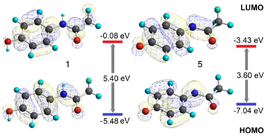 ![]() Figura 7. HOMO (abaixo) e LUMO (acima) do PAR (1) e NAPQI (5)