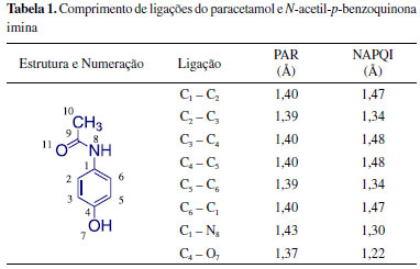 Assim, a perda das duplas alcênicas mostra a diferença de reatividade química entre NAPQI (carbonos sp2 alcênicos) e PAR (carbonos sp2 aromáticos), uma vez que alcenos reagem rapidamente com soluções de bromo (de cor vermelha), sem aquecimento, tornando-as incolor, através de reações de adição a dupla carbono-carbono (C=C), enquanto que compostos fenólicos não reagem nestas condições devido ao seu caráter aromático, necessitando do uso de catalisadores para promover uma reação de substituição eletrofílica no anel benzênico.48 Os cálculos teóricos para as geometrias do PAR (1) e seu derivado oxidado NAPQI (5) que relacionam suas distâncias de ligação estão descritos na Tabela 1.
