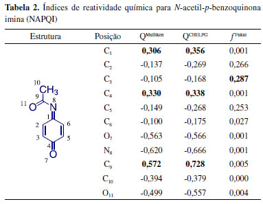 Os valores de cargas de Mulliken e CHELPG foram capazes de distinguir as posições mais reativas para os carbonos carbonílicos (C4 e C9) e imínico (C1), mas não foram capazes de explicar a reatividade química da NAPQI na posição 3 com a NAC, como um sitema de Michael, mas foi corretamente nessa posição (0,287) pelos índices de Fukui, explicando a formação do intermediário de adição eletrofilica responsável pela toxicidade hepática e carcinogenicidade do paracetamol.53-55 Os resultados para os demais compostos sugerem que outros efeitos como a protonação enzimática podem alterar as posições reativas desse intermediário tóxico.33