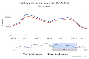 ![]() Figura 1. Número de acessos mensais de Química Nova ao longo do ano de 2021.