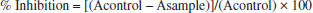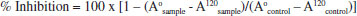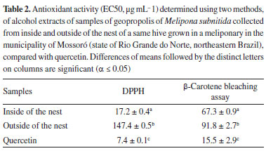 Antioxidant assays DPPH method Radical scavenging capacity of the samples was evaluated by mixing 1.5 mL of 300 µM DPPH in ethanol. The ethanolic extracts of geopropolis collected inside and outside of the nest were prepared at concentrations of 15, 30, 45 and 60 μg/mL in Eppendorf reaction tubes (1.5mL), all in triplicate. Methanol solutions of quercetin at 2.5, 5.0, 7.5, 10.0, 15.0 and 30.0 μg/mL were used as reference. The reaction mixtures were vortexed, left in the dark at 25 °C for 30 min and the absorbances measured at 517 nm. Negative control solution was prepared using only DPPH and absolute ethanol. The absorbance was measured in a SynergyT; Neo2 Multi-Mode Microplate Reader. The results were expressed as efficient concentration (EC50). The ability to scavenge DPPH radical was calculated as % inhibition by the following equation: ![]() where Acontrol and Asampe are the absorbances of control and samples, respectively β-Carotene bleaching method The inhibition of oxidative loss of β-carotene in a β-carotene/linoleic acid emulsion was used to assess the antioxidant ability of the geopropolis extracts collected inside and outside of the nest. β-carotene (200 µg) dissolved in chloroform, 25 µL of linoleic acid and 200 µL of Tween 40 was solubilized in 50 mL of distilled water. The chloroform was evaporated and was added distilled water to form an emulsion. The emulsion was tested using 400 μL of the geopropolis solutions at concentrations of 40, 80 and 120 μg/mL in Eppendorf reaction tubes (1.5 mL), all in triplicate. The vials were then capped and placed at 50 °C in a water bath for 4 hours. The oxidation of β-carotene emulsion was monitored by measuring the absorbance at 470 nm, recorded immediately after the addition of the sample extracts. Ethanol (80%) was used as control. The absorbance was measured in a SynergyT; Neo2 Multi-Mode Microplate Reader and was determined every 20 min until 120 min at 470 nm. The inhibition activity to prevent β-carotene bleaching was calculated by the formula: ![]() where Aosample, A120sample, Aocontrol and A120control are the absorbances of sample and control at t = 0 min and t = 120 min, respectively