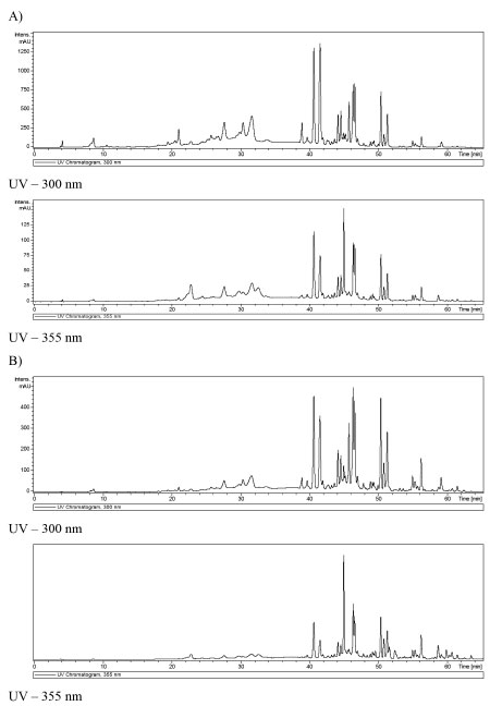 ![]() Figure 2. A) Chromatography profile of ethanolic extract from geopropolis of M. subnitida collected inside of the nest, at UV - 300 (above) and 355 nm (below); B) Chromatography profile of ethanolic extract from geopropolis of M. subnitida collected outside of the nest, at UV - 300 (above) and 355 nm (below)