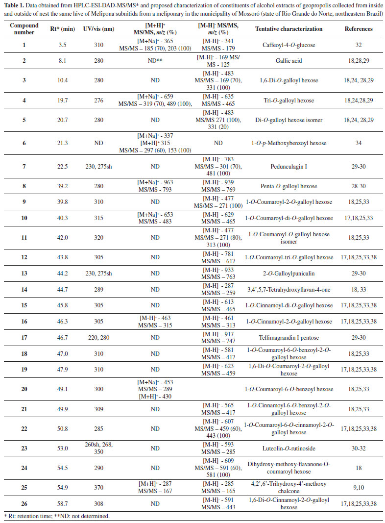 CONCLUSIONS Propolis of stingless bees is a source of biologically active constituents rarely or not known in honeybee propolis. Hydrolyzable tannins and complex galloyl-phenylpropanyl-glycosides are examples of constituents common in propolis of meliponines and rare in propolis of honeybees. The overall composition of geopropolis may render a product with relatively high antioxidant capacity. On the other hand, the high variability of chemical profile of geopropolis of Melipona species is a factor requiring strategies aiming the standardization of the product. In addition to constituents derived from plants, biologically inactive constituents (possibly soil material) represent another source of constituents contributing to increase the chemical variability of the product. The results demonstrated that geopropolis from M. subnitida collected inside of nest is rich in bioactive phenolic compounds with antioxidant activity. On the contrary, the sample collected outside of the nest, with low content of bioactive compounds, exhibited little antioxidant activity. Further studies are needed aiming to establish parameters of quality of geopropolis, without which no conditions will be met for reliable food formulation and pharmaceutical use of the product. A deeper understanding of the importance of resin for stingless bee colony function, that depend on diverse resin sources to carry out a variety of functions, could lend support to the conservation of resources that are overlooked. SUPPLEMENTARY MATERIAL Chromatography profile of ethanolic extract from geopropolis of M. subnitida collected from inside the nest and the mass spectra of constituents 1-26, in negative and positive ionization mode were provided in Figures 1S-34S.