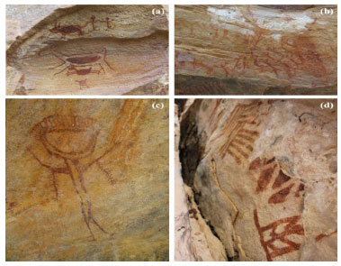 ![]() Figura 1. Representações de grafismos pré-históricos de antropomorfos (a), fitomorfo (b), antropomorfo (c) e geométricos (d) de sítios do Parque Nacional Serra da Capivara, Piauí