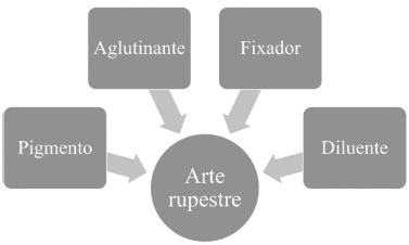 As manifestações humanas podem ser observadas em diferentes formas, pintadas e/ou gravadas. A técnica de produção gravada consiste na incisão ou picoteamento do suporte rochoso feito com o uso de alguns utensílios; já a técnica por pintura parte do princípio do preparo de pigmentos de cores distintas, que podem ter origem variada. A produção dos pigmentos utilizados para execução das pinturas rupestres está correlacionada a diferentes aspectos ambientais e culturais, que variam desde a escolha da matéria-prima e a disponibilidade desta em território até as características socioculturais e simbólicas dos grupos ou indivíduos que as produziram.45 O estudo interdisciplinar deste material pode proporcionar importantes informações sobre as comunidades pré-coloniais e nos aproximar, em parte, de seus contextos sociais. Demonstrações a respeito da diversidade de materiais usados na produção da arte parietal podem ser observadas a partir do terceiro milénio A.C. (antes de Cristo) nas pinturas realizadas pela comunidade egípcia, por exemplo, onde os pintores, ao trabalharem na ornamentação de túmulos, aplicavam - após uma camada de gesso - pigmentos de colorações pretas, avermelhadas, amareladas, esverdeadas, etc.45 No período pré-colonial a relevância da matéria-prima utilizada nos registros rupestres pode ser observada através da documentação de minas de ocre datadas a partir do neolítico.46 De modo geral, os pigmentos são elementos multicolores e que compõe o corante, substância que atribui cor as pinturas. O corante é diluído em algum tipo de solvente (diluente) e em junção a aglutinantes, pigmentos e outros aditivos colore a arte rupestre por meio de processos físico-químicos.47 Acredita-se que os autores dessa arte pretérita foram os responsáveis pelos conhecimentos sobre as tintas que temos hoje, pois ambas são essencialmente compostas por pigmento, aglutinante fixadores e diluente (Figura 2).48