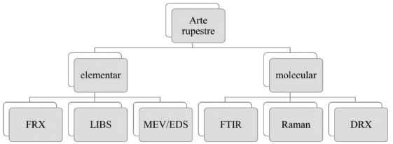 ![]() Figura 3. Principais técnicas de análise elementar e molecular utilizadas no estudo da arte rupestre