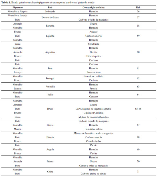 A substância que vem a unir e uniformizar os pigmentos pré-históricos tais como as tintas atuais, são os aglutinantes. Os aglutinantes presentes em periodos pré-históricos são em geral de origem orgânica tais como cera de abelha, gema de ovo, a goma-arábica e resinas naturais provindas de plantas.49 Outro importante componente são os fixadores, agentes finalizadores e essenciais para o preparo das tintas rupestres, os quais têm a função de promover aderência ao suporte rochoso. Eram empregados como fixadores sais a base de óxidos ou sulfatos de cálcio.49 A produção dos pigmentos para adição ao corante pode ser feita por meio de diversas técnicas, além destes serem classificados como inorgânicos ou orgânicos e naturais, artificiais ou sintéticos. Os estudos das pinturas rupestres, majoritariamente, apresentam em sua composição pigmentos naturais e inorgânicos, entretanto, devido aos registros etnográficos sabe-se que compostos orgânicos também eram utilizados, mas estes raramente são constatados, provavelmente por necessitarem de condições específicas para sua conservação.50 Pigmentos inorgânicos como ocres e outros óxidos metálicos são frequentemente reconhecidos em estudos de caracterização mineralógica feitos em pinturas.51 Segundo Casqueira e Santos,52 isso ocorre devido ao fato de que eles apresentam melhor estabilidade química e térmica se comparados aos pigmentos orgânicos. No entanto, deve-se considerar também que os pigmentos orgânicos têm durabilidade menor e desaparecem mais rápido. Quanto a classificação "naturais, artificiais ou sintéticos", consideram-se pigmentos naturais aqueles que somente passam por processos de origem física, como por exemplo, a maceração. Já os artificias recebem este nome porque são resultados de experimentos físico-químicos, muitas vezes tratamentos térmicos, que acabam modificando as composições químicas e minerais do produto original. Os sintéticos, por sua vez, são aqueles que não são encontrados prontos na natureza, mas sim feitos a partir da junção de diferentes elementos. Durante o período pré-colonial, os pigmentos podiam ser utilizados para a produção dos corantes ou até mesmo aplicados diretamente sobre a rocha.53-55 Diferentes tipos de pigmentos e a forma como são trabalhados, resultam em diferentes cores.51 A Tabela 1 apresenta um levantamento geral de alguns trabalhos envolvendo o estudo da composição química da arte rupestre espalhada em diversas partes do mundo.