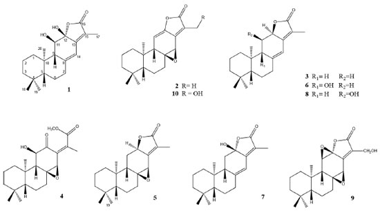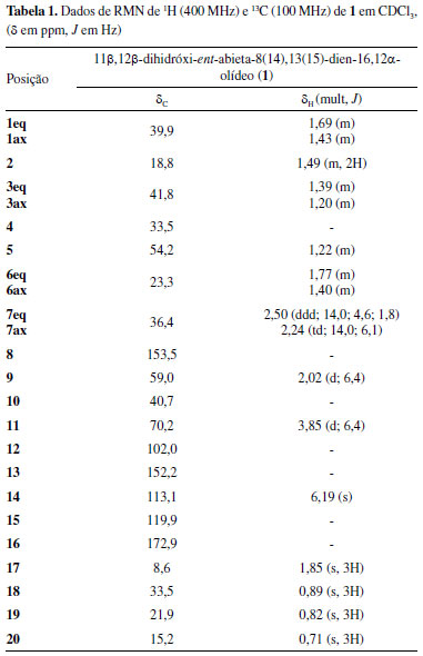 RESULTADOS E DISCUSSÃO O estudo químico do extrato hexânico das raízes de E. phosphorea levou ao isolamento de dez compostos (1-10) (Figura 1), sendo um novo diterpeno 11β,12β-dihidróxi-ent-abieta-8(14),13(15)-dien-16,12α-olídeo (1) e nove compostos relatados anteriormente na literatura. Suas estruturas químicas foram determinadas com base na análise de dados espectroscópicos de RMN uni e bidimensionais, espectrometria de massas de alta resolução com ionização por electrospray (EMAR-IES), infravermelho (IV), dicroísmo circular eletrônico (ECD, do inglês Eletronic Circular Dichroism) e comparação com dados na literatura. Os dados de RMN de 1H e 13C do composto 1 estão compilados na Tabela 1.