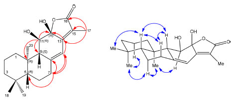 ![]() Figura 2. Principais correlações observadas no mapa de correlação HMBC (setas em vermelho) e NOESY (setas em azul) do composto 1