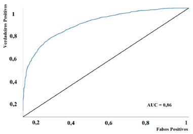![]() Figura 3. Curva ROC, verdadeiros positivos versus falsos positivos, gerado para o modelo RF AUC - área sob a curva