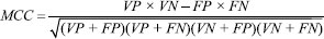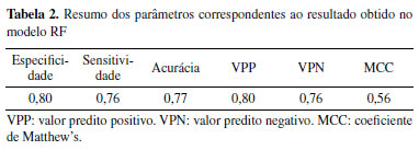 Modelo preditivo para M. tuberculosis Na análise do modelo de predição RF, foi observado que o modelo preditivo para M. tuberculosis construído obteve bons resultados de desempenho, com uma acurácia de 77%. A curva ROC e o MCC também obtiveram resultados satisfatórios, curva ROC foi de 0,86 e MCC a 0,56, revelando um modelo com boas taxas de classificação, performance e robustez. É importante lembrar que modelos perfeitos possuem valores de performance de 1 (100%). Uma curva ROC demonstra de maneira tridimensional a performance de um modelo e representa a sensibilidade (verdadeiro positivos) em função dos falsos positivos (1 - especificidade). É calculado então a área sob a curva (AUC) aonde seus valores vão de 0 a 1. Quanto mais próximo de 1 do eixo Y melhor é o acerto do modelo.35,36 A Tabela 2 descreve as características do modelo quanto ao poder preditivo e a Figura 3 revela a performance e robustez do modelo através da curva ROC.