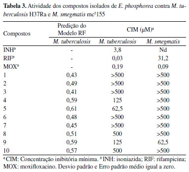 Atividade antimicobacteriana Os dez compostos isolados de E. phosphorea apresentaram baixa atividade frente as cepas de M. tuberculosis H37Ra e M. smegmatis mc2155 (Tabela 3). Entre todos os compostos, o composto 5 apresentou inibição do crescimento com a menor concentração (CIM = 62,5 µmol L-1), validando o modelo preditivo que indicava esse composto com a maior probabilidade de apresentar atividade contra para M. tuberculosis. O composto 9 foi o único entre os testados a apresentar resposta inibitória contra M. smegmatis, também com CIM de 62,5 µmol L-1.
