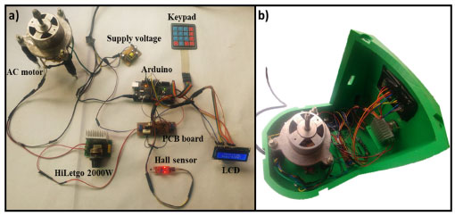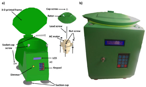 ![]() Figure 2. a) 3D schematic design of the centrifuge and, b) 3D-printed Centrifuge with AC motor inside