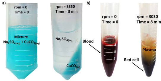 ![]() Figure 5. Phase separation through the fabricated centrifuge before and after the centrifugation process for (a) CuCO3 precipitate and (b) human blood using the R50 and R15 rotor, respectively