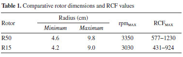 TESTING THE CENTRIFUGE Performance experiment To determine the system performance, different samples of suspensions and immiscible liquids were placed in tubes and spun at high speed. As a consequence of the radial acceleration applied, the heavier particles settle to the tube bottom, while at the same time a slighter substance rise to the top. The force applied to the tubes depends on the diameter of the centrifuge motor. Another important parameter to consider in the centrifugation process is the relative centrifugal force (RCF) or g-force which can be calculated by the equation (3):20 ![]() Where r and rpm are the radio of the rotors in centimeters and the value of the revolution per minute of each rotor, respectively. RCF values calculated by equation (3) for the R50 and R15 rotors are presented in Table 1. As shown in Table 1, the R50 rotor has a higher RCF value than the R15 mainly due to rpmMAX.