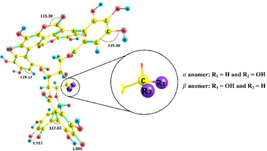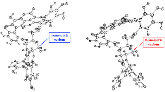 ![]() Figure 2. Optimized geometries of α (a) and β (b) anomers by using B3LYP/6 31+G(d,p) level of theory