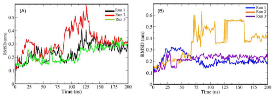 ![]() Figure 3. Root Mean Square Deviations (RMSD) for punicalagin α (A; black, red and green lines) and β (B; blue, orange and violet lines) anomers. All MD simulations were performed in three replicates each anomer studied