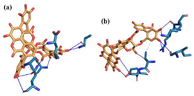 ![]() Figure 4. Details of interactions of α- (a) and β- (b) anomers with Mpro receptor residues. blue lines represent hydrogen bonds between α- (a) or β- (b) anomer with pocket Mpro residues