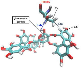 ![]() Figure 5. Representative highlight of non-covalent interactions between residue THR45 Mpro and β-anomer. The blue dashed lines are the hydrogen bonds and gray dashed line is the hydrophobic interaction