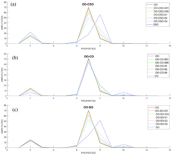 Then, groups were formed by adding 1%, 5%, 10%, 20% and 40% CSO, CO and SO to OO in each data set. Mixed oils were then analyzed in the GC instrument. Each of the OO-CSO, OO-CO and OO-SO data sets consisted of 140x13 values. The dataset consisting of 420x13 values in total was used for classification and regression. In the dataset, the value 420 expressed as a row indicates the number of samples, and the value 13, expressed as a column, indicates the properties of the oil. Figures 2a, 2b and 2c graphically show the fatty acid compositions of OO-CSO, OO-CO and OO-SO mixed oils.