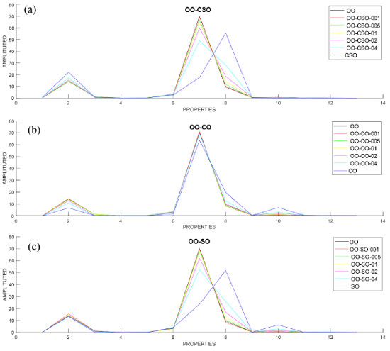 ![]() Figure 4. Graphic representation of fatty acid compositions after regression determined for OO-CSO, OO-CO and OO-SO mixed oils