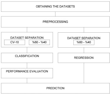 Recommended classification system The classification system recommended in this research is given in Figure 3. First, the data set was obtained and converted into a suitable format to be further analyzed in the computer environment; then, the normalization process was applied. Classification and regression were performed using the features of oils. The data sets obtained for classification and regression were divided into two groups: training and test data. 60% of the data were used as training data and 40% as test data. Then, cross-validation, which is another decomposition method, was performed. Cross-validated data sets were used in both the training and testing processes. Thus, the software was prevented from memorizing the training and test values. The classification algorithms used were SVM, k-NN and DT. The purity and adulteration of OO were determined using the NN algorithm for regression.