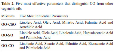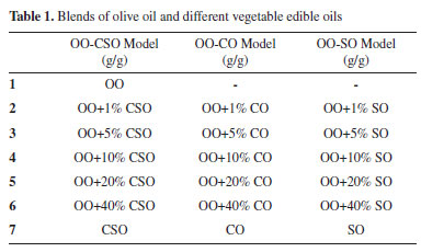 EXPERIMENTAL Samples OO, CSO, CO and SO used in the analysis were procured from local manufacturers as 4 different samples of 5 kg each. OO was adulterated using three different models: by blending OO and CSO (OO-CSO), blending OO and canola oil (OO-CO), and blending OO and soybean oil (OO-SO). A total of 19 subgroups were obtained by adding 1%, 5%, 10%, 20% and 40% of the other vegetable oils to the OO in each model. 20 samples from each subgroup were prepared and analyzed (Table 1).