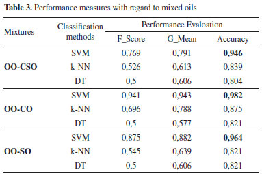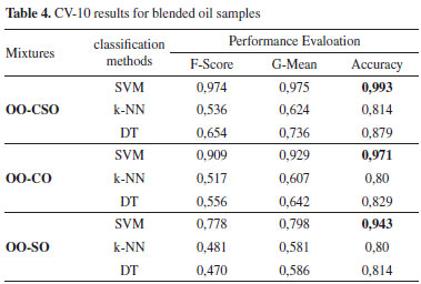 Comparison of the performance measures revealed that highest performance was obtained with the SVM algorithm at 0.982 with the accuracy measure in the OO-CO mixed oil. As there was a high number of classification groups, other performance measures were also evaluated; accordingly, the performance rates obtained with the SVM algorithm were 0.941 for F-score and 0.943 for G-mean. The highest performance for the OO-CSO mixed oil was obtained with the SVM algorithm at 0.946 with the accuracy measure, 0.769 with the F-score measure and 0.791 with the G-mean measure. The highest performance for OO-SO mixed oil was obtained with the SVM algorithm at 0.964 with the accuracy measure, 0.875 with the F-score measure and 0.882 with the G-mean measure. 10-fold cross validation (CV-10) was performed in order to transfer all the values used in the research to the training and testing phases. The same performance measures used in the previous application were applied as classification performance measures. The performance measures computed using CV-10 are shown in Table 4.