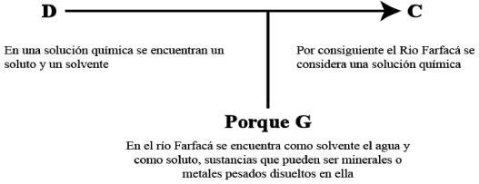 Rodriguez y Díaz-Higson10 consideran que los estudiantes cuando se aprestan a aprender conceptos científicos presentan ideas previas, las cuales les sirven para comprender lo que se les está enseñando, de modo que las nuevas ideas interactúan con sus representaciones previas. Investigaciones sobre las concepciones alternativas de los estudiantes, han mostrado que después de años de estudio en instituciones en los que se ha enseñado a los estudiantes las concepciones correctas, estos continúan teniendo concepciones alternativas que no se relacionan con las científicamente aceptadas, tal como lo expone Carrascosa-Alís11 "Según estudios realizados por Laurence Viennot 1979 atrajo la atención sobre el problema del aprendizaje conceptual, que cuestionaba la efectividad de la enseñanza allí donde los resultados parecían más positivos; los alumnos no sólo terminaban sus estudios sin saber resolver problemas y sin una imagen adecuada del trabajo científico, sino que la inmensa mayoría de ellos ni siquiera había logrado comprender el significado de los conceptos científicos más básicos. Particularmente relevante era el hecho de que los errores que cometían no se debían a simples olvidos o a que se daban respuestas al azar, sino que se justificaban con base en determinadas ideas, las cuales eran definidas con bastante seguridad por un gran número de estudiantes de distintos niveles educativos". Las concepciones alternativas en los PCNFI pueden estar asociadas al lenguaje cotidiano, a los textos utilizados durante otra etapa escolar, a las ideas transmitidas por los docentes, lo cual hace que estas ideas persistan en ellos y sean consideradas como aprobadas en un ámbito más científico. Por tal razón se aplicó el test de concepciones alternativas a los futuros profesores para identificar algunas de esas concepciones arraigadas en su aprendizaje que en un momento pueden concebir conclusiones apresuradas. A continuación se muestran los resultados obtenidos en este test, como se muestra en la Tabla 2. Secuencia de actividades Después de realizar la fase de diagnóstico de la investigación de manera individual se implementó la secuencia de actividades, la cual fue realizada en grupos de laboratorio. Los resultados obtenidos se describen a continuación siguiendo el esquema básico de argumentación propuesto por Toulmin, con la adaptación al tema de soluciones químicas, en vista que los estudiantes no alcanzan niveles más complejos de argumentación en el que se involucran otros aspectos que podrían ser analizados. El modelo incluye un dato, una garantía y una conclusión del argumento. Este modelo se empleó para mostrar de una manera sencilla como los futuros profesores involucran los elementos básicos de un argumento. Toulmin2 simboliza con una flecha la relación que hay entre los datos (D) y la conclusión (C) que sustentan. Además, indica la garantía (G) que apoya tal vínculo entre datos y conclusión, la cual la escribe debajo de la flecha. El Dato, afirmaciones que se encuentran disponibles por el hacedor del argumento y puede contener, puntos de vista actuales, acciones anteriores o presentes. La Garantía, razones de pretensión o reglas para afirmar que los datos son correctos para explicar una cuestión en particular o una premisa y emitir una conclusión. A continuación se describe la estructura el argumento propuesto por Toulmin,2 ver Figura 1. Para los resultados de la investigación se han establecido las siguientes convenciones: PCNFI: Profesor de Ciencias Naturales en Formación Inicial. TXEG: Textos escritos en grupo, TXEG1, TXEG2, TXEG6, TXEG11, TXEG14 PA: Pregunta de cada Actividad, P1A1, P2A1, P4A1; P5A2, P6A2; P1AI3, P2AI3, P1AII3. IELG: Informes Escritos de Laboratorio Grupal, IELG1, IELG2, IELG6, IELG11, IELG14. Se tomaron algunos de los grupos que desarrollaron las actividades al igual que algunos ítems planteados en cada una de las actividades de la secuencia de manera conveniente con la intencionalidad de analizar sus respuestas en algunos interrogantes propuestos que permiten evidenciar el proceso argumentativo según el modelo de Toulmin trabajado. Actividad n° 1 (ver Tabla 3): ¿conoces acerca del río farfacá?