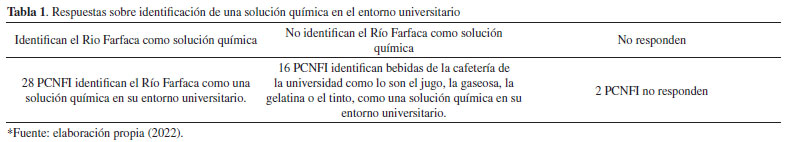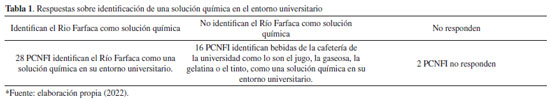 RESULTADOS Y ANÁLISIS Cuestionario exploratorio sobre soluciones, propiedades y preparación Los PCNFI (profesores de ciencias naturales en formación inicial) participantes de la investigación contestaron un taller exploratorio de manera individual en la que se buscó visualizar las percepciones que tienen los participantes en cuanto al tema de las soluciones químicas a través de 4 preguntas, y los resultados obtenidos en estas se resumen a continuación. A partir de las respuestas dadas a la pregunta 1 se organizaron en tres aspectos que se relacionan en la Tabla 1, la respuesta esperada es que los PCNFI identifiquen fácilmente el Rio Farfacá como una solución química, pero en su gran mayoría identifica alimentos de la cafetería como una solución química más que el Río Farfacá.