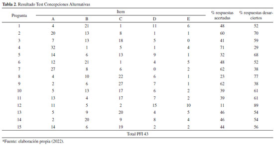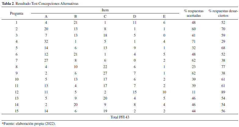 Test exploratorio sobre concepciones alternativas en soluciones Para tener una mejor visión acerca de las concepciones que presentan los PCNFI se aplicó un test de concepciones alternativas, con pregunta cerrada en el que se relacionan conceptos del tema de soluciones químicas, el cual pretende verificar cual es la tendencia de respuesta de PCNFI en cuanto al tema de soluciones químicas como se relaciona en la Tabla 2.