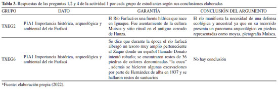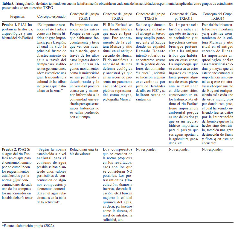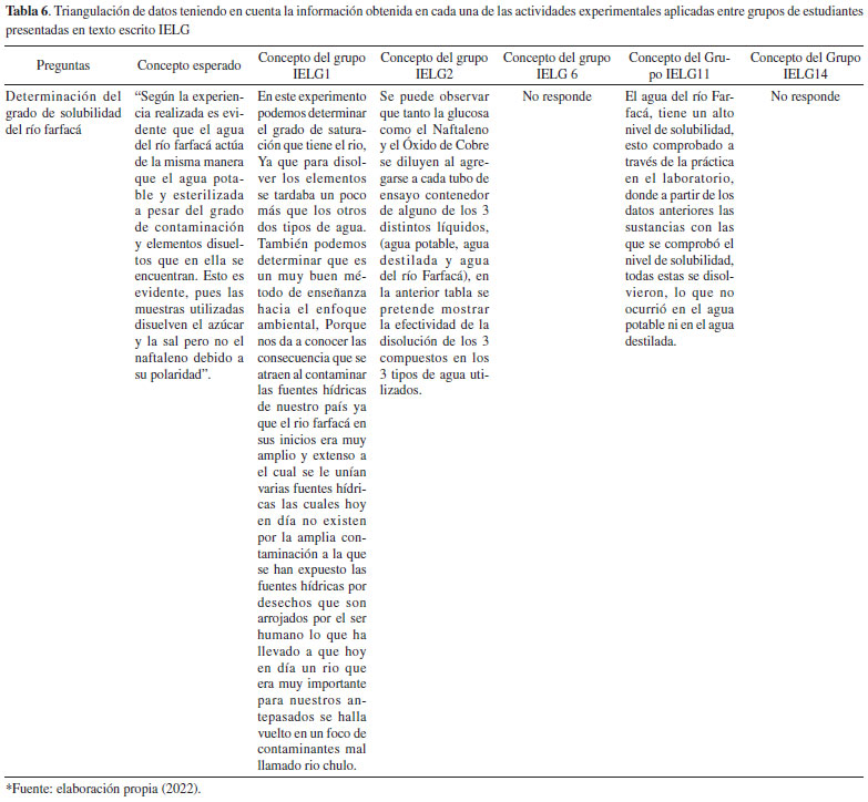 Después de realizar la triangulación de la información entre diferentes grupos de estudiantes y las actividades desarrolladas, se identificó algunos aspectos interesantes, que permitieron detectar las dificultades que muestran los estudiantes en la elaboración de procesos argumentativos evidenciados al trabajar la secuencia de actividades. En la primera actividad en la que los estudiantes tienen que redactar su propio argumento textual por grupo de estudiantes se pudo identificar que muestran facilidad para responder según el criterio establecido como respuesta a la pregunta seleccionada. Ver Tabla 3 (TXEG2). Esto se da como consecuencia a que previo a la pregunta seleccionada se les había asignado un texto con información importante relacionada con el Río Farfacá. En la segunda prueba se presentó mayor dificultad en el momento de elaborar un argumento, pues la mayoría de los grupos no dieron respuesta a la pregunta propuesta en esta actividad, esto puede ser consecuencia de la falta de interpretación de información suministrada en la actividad. En dicha actividad se suministró información organizada en una tabla y en la que los futuros profesores mostraron dificultad en el momento de elaborar un argumento de estos datos en relación con el agua del Río Farfacá. Ver Tabla 4 (IELG14). En la tercera prueba aplicada los PCNFI elaboraron buenos argumentos de manera textual pero utilizando recursos y fuentes bibliográficas para dar respuesta al cuestionamiento propuesto; sin embargo, es evidente que no se reconoce ningún caso del contexto con la problemática mencionada en la actividad. En las siguientes actividades que se evaluaron a manera de informes escritos se identificó que los grupos de PCNFI muestran mayor dificultad para elaborar argumentos, pues tienen que dar respuesta lógica y coherente en relación a una práctica experimental donde se observó que hay una gran dificultad en el momento de interpretar la información obtenida y plasmarla en un escrito con argumentos claros que puedan dar cuenta de la comprensión del experimento. Es pertinente aclarar que aunque los PCNFI trataron de elaborar argumentos coherentes, aún muestran inconvenientes en el momento de proponer conclusiones claras sobre experiencias del contexto tal como lo afirma Archila:13 "La falta de preparación que afrontan los profesores de Química en formación inicial acerca del tema de la argumentación genera limitaciones para que los futuros profesores involucren esta habilidad de pensamiento dentro de sus propósitos de enseñanza y aprendizaje" De igual manera, López14 en su trabajo de investigación encontró que "los estudiantes presentaron argumentos de nivel 1 al mencionar premisas en las cuales no se identifican claramente datos, conclusiones, justificaciones y en algunos casos son evidencias de situaciones cotidianas". Otro aspecto que es importante recalcar es que los PCNFI cuando tenían un apoyo escrito se valían de éste para poder elaborar su argumento como se puede observar en las TXEG de la Tabla 5 demostrando una mayor facilidad en el momento de dar una respuesta bien argumentada. Sin embargo en las pruebas IELG de la Tabla 6 donde el apoyo con el que cuentan los estudiantes para elaborar respuestas bien argumentadas son los resultados obtenidos en una práctica experimental, se vieron limitaciones en la interpretación de la información y sobre todo se hizo obvio al momento de elaborar argumentos de la experiencia que se procuren acercarse al criterio establecido como respuesta.