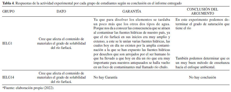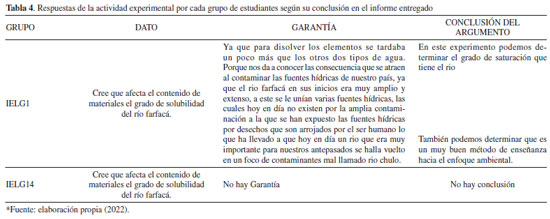 Teniendo en cuenta los resultados obtenidos en la actividad 1 trabajada en la secuencia, y observando la Tabla 3, se ha podido evidenciar que cada grupo reconoce algunos aspectos del Río Farfacá y su calidad como fuente hídrica, pero cuando se les solicita que elaboren una conclusión en la mayoría de los casos no integran fácilmente la garantía con los datos, por consiguiente el argumento planteado es mínimo ya que carece de elementos que le proporcionen validez y se constituyan más en opiniones personales desde una percepción cotidiana más que un argumento estructurado desde el conocimiento propio de las ciencias. Por ejemplo el grupo 6 recurren a datos históricos frente al río Farfacá pero no inducen esos datos para construir una conclusión que reafirme un argumento, falta elementos de apoyo para que este tenga solidez y su intervención sea entendible. Por otra parte, hay grupos que no tuvieron en cuenta una garantía para dar sustento a la conclusión planteada o definitivamente no aparece esta, careciendo de relevancia las alternativas de solución frente a situaciones expuestas, por lo tanto los argumentos resultantes no satisfacen los alcances teóricos científicos y no constituyen un argumento regular. Además en lo que concierne a la problemática ambiental todos los grupos expresaron que el río ha sido descuidado y que gran parte de desechos a lo largo de curso han sido vertidos en él y que la actividad humana ha influido para que se agrave el problema pero ninguno muestra una conexión de las ideas para generar un argumento, es decir llegan a una conclusión sin una garantía que la respalde. Cabe resaltar que los estudiantes muestran una apropiación de su contexto natural reconociendo la importancia cultural que ha tenido el Río Farfacá a través del tiempo a la población boyacense y lo corroboran por medio de sus escritos. Actividad experimental n° 1: determinación de solubilidad Haciendo una comparación de los resultados anteriores con la Tabla 4 se observó que los estudiantes muestran gran dificultad en el momento de elaborar un argumento bien estructurado sin ayuda de fuentes bibliográficas; esto radica en que los estudiantes no tienen claros algunos conceptos relacionados con solubilidad y su determinación de manera experimental. Según Jiménez-Aleixandre:12 "El énfasis en la aplicación de lo aprendido no es una cuestión menor, pues uno de los problemas del aprendizaje escolar (sea de ciencias, matemáticas, sociales u otras materias), detectado tanto por el profesorado como por la investigación educativa, es la incapacidad de una gran proporción del alumnado para aplicar los conocimientos y destrezas a situaciones nuevas".