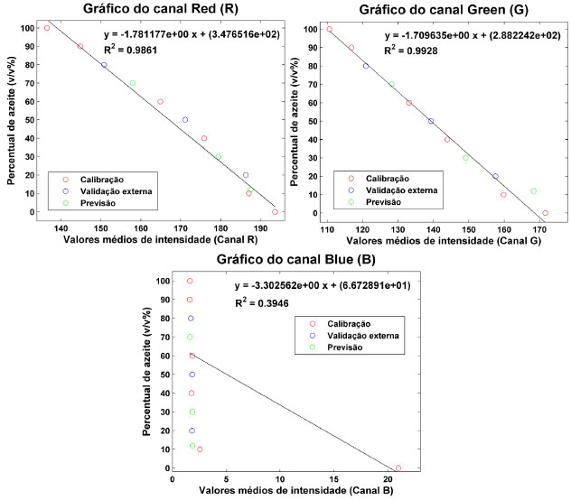 A partir das curvas analíticas obtidas, é possível notar que os canais R e G apresentaram boa linearidade entre os valores médios de intensidade de cor do sistema RGB e o percentual de azeite presente nas misturas. Os coeficientes de determinação obtidos para o canal R e G foram 0,986 e 0,993, respectivamente. Por outro lado, o canal B não exibiu uma boa linearidade e apresentou um coeficiente de determinação de 0,395.