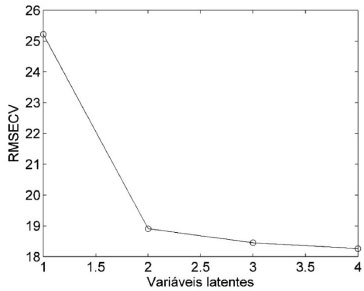 ![]() Figura 2. Gráfico do número de variáveis latentes vs o valor de RMSECV