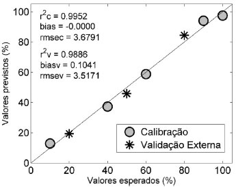 ![]() Figura 3. Gráfico dos valores esperados vs valores previstos para a calibração e validação externa