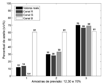 ![]() Figura 4. Valores esperados vs valores previstos para a amostra comercial de óleo composto (12%) e as misturas de 30 e 70%, nos canais R, G e B