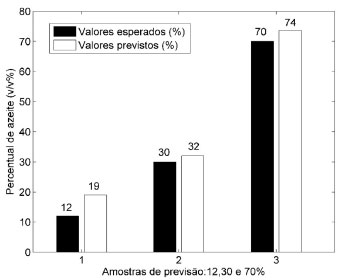 ![]() Figura 5. Valores esperados vs valores previstos para a amostra comercial de óleo composto (12%) e as misturas usadas na previsão (30 e 70%) usando o modelo multivariado