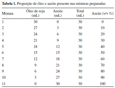 PARTE EXPERIMENTAL Preparo de amostra As amostras de óleo de soja e azeite de oliva extra-virgem foram adquiridas em supermercados na cidade de Campinas - SP. A Figura 1S, disponível no Material Suplementar, apresenta os frascos das amostras que foram utilizadas. No total foram adquiridas 6 marcas de azeite de oliva extra-virgem, 5 marcas de óleo de soja e 1 amostra de óleo composto (soja + azeite, 12 %). Para construir a curva analítica, foi preparada uma única mistura com volumes iguais de todas as marcas de óleo de soja. O mesmo procedimento foi adotado para as amostras de azeite de oliva extra-virgem. A partir disso, foram preparadas misturas entre óleo de soja e azeite de oliva em diferentes proporções, de acordo com a Tabela 1.