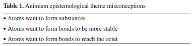These new sentences were classified into seven epistemological themes proposed based on secondary sources of the historical development of the concept.8 Each theme represents one or more theories or models related to the covalent bond across the scientific development of the covalent bond concept. The periods considered were those associated with the ideas of affinity in the XVIII century,18 chemical ideas from Berzelius to Lewis,19,20 and finally the period associated with the valence bond, molecular orbitals, and density functional theory.21-23 Next, we present the classification of sentences in themes. The conceptions of the covalent bond in the literature The Animism epistemological theme represents theories about affinity, from the XVIII century, and indicates an attribution of human characteristics. All misconceptions identified are shown in Table 1, including the word "want," which is related to atoms desire to establish a bond, as the theoretical model could present feelings just like human beings. Nicoll,24 for example, reported answers from an interview where the senior level students associated the bond formation as a way of atoms being happy for such achievement. Another highlighted example is Kind's25 study showing a value judgment of bonds, where the covalent is the good one because it "shares an electron" and ionic is the bad one because it "steals an electron," reported from pre-service teachers of chemistry, physics, and biology. All subsequent articles, identified as Animism, followed in the same direction presenting some human characteristics attributed to atoms or molecules, from secondary students to prospective teachers, such as in Kabapınar,26 Luxford and Bretz,27 Özgür Özcan and Temel,28 and Jenkins and Shoopman.29 Instead of attributing feelings to atoms, specialized literature points out that students should relate these phenomena to calculable and scientific parameters as energy variations, for instance.