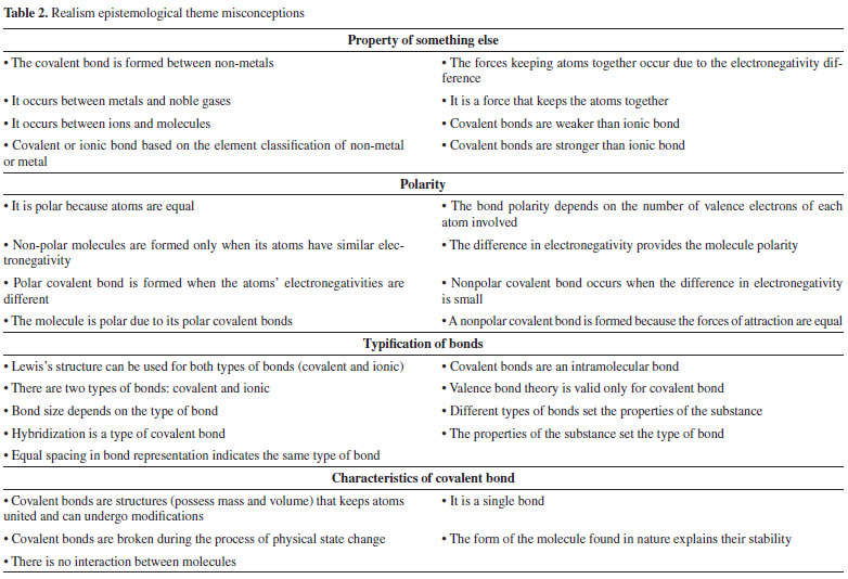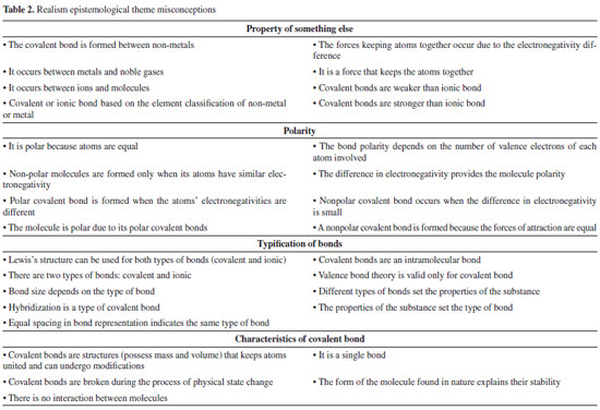 Although in that century (of affinity concept) there was not a concept as "octet," the theme refers to the bond, specifically, associated with a human feeling. According to some authors,24,25 this anthropomorphization can be the result from the first contacts with the concept of bond between atoms, when some teachers, or even textbooks, use it as an analogy for introduction to the topic. The reported problems, foreseen in misconception literature, are the difficulties of detaching from this conceptualization. Instead of understanding it as a phenomenon with its own bases (math, physics), students can extrapolate it to other situations, as atoms being "kind" because they share an electron to form a covalent bond and ionic bond being "mean" because it steals an electron.25 In the sequence, the epistemological theme named Realism was differentiated from Animism because the conceptions related to it were not linked to the idea of anthropomorphization. Besides, its main characteristic is the understanding of a bond as something secondary, a consequence of another concept. Commonly, these conceptions showed an indiscriminate use of words, without specifying how it fits in that context, such as "attraction" or "stability,"24,25 as can be seen in Table 2. The table is divided into subtopics for better comprehension and analysis. In the first group of misconceptions, all sentences refer to the covalent bond as a property controlled by atoms, ions, molecules, etc. as if all these other concepts controlled what kind of bond occurs, prior to the phenomena. Even if some relations may be usual, students and teachers should be aware of the difference between the examples of compounds with covalent bonds and the definition of the concept itself. Besides, some relations in these misconceptions' sentences are not usual, as the bond occurring between metals and noble gases, what may indicate that students simply memorize some concepts and try to establish a connection. In this latter case, the misconception is not for an example of covalent bond compound. We observed a classificatory use of words in reports from secondary students to prospective teachers, such as "metals" or "nonmetals," for explaining the bond as a property of atoms, so the covalent bond is the one formed, for instance, between nonmetal elements.28,30-32